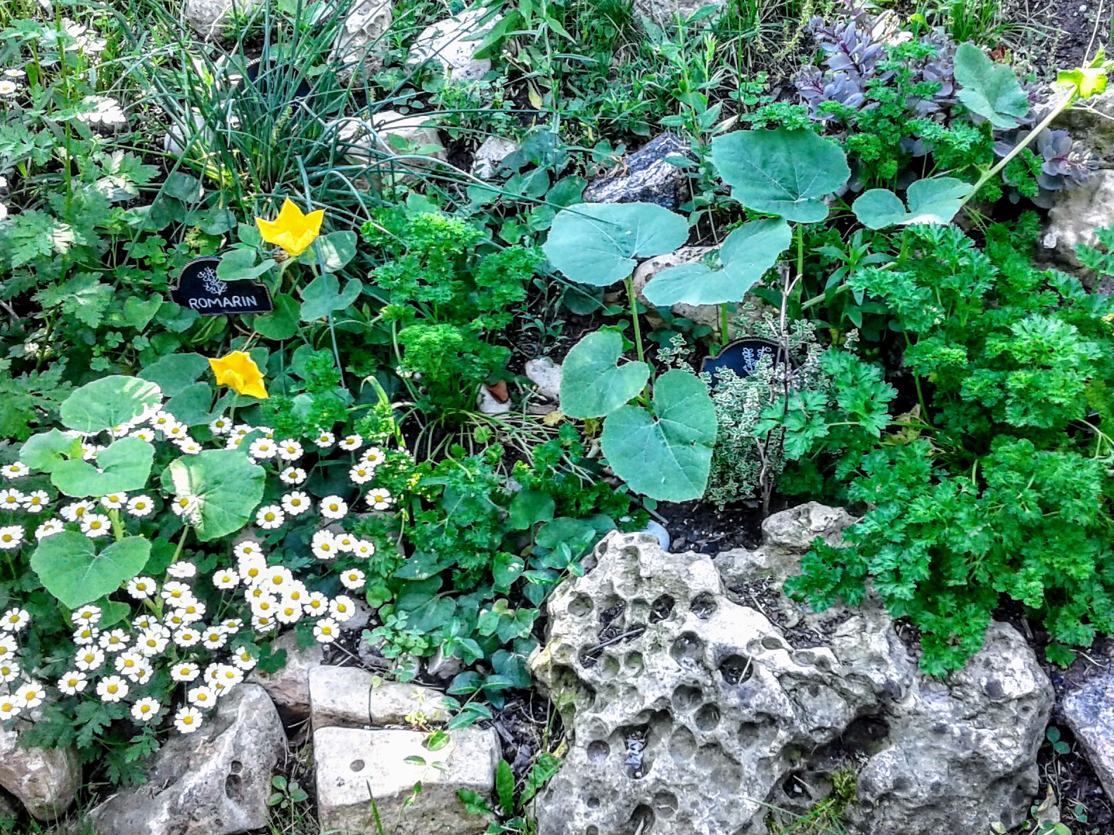 We had been trying to figure out what to do with a sharp slope (almost 90 degree drop of about 5 feet) leading to a strip of lawn about 3 feet wide. These old houses in our neighbourhood were built on a hill above a river, and there are sharp almost terraced slopes throughout the neighbourhood. There were hundreds of rocks in the yard, so we decided to make a rockery/herb garden. Our dog cannot visit this area – so that’s a bonus when there is food growing.