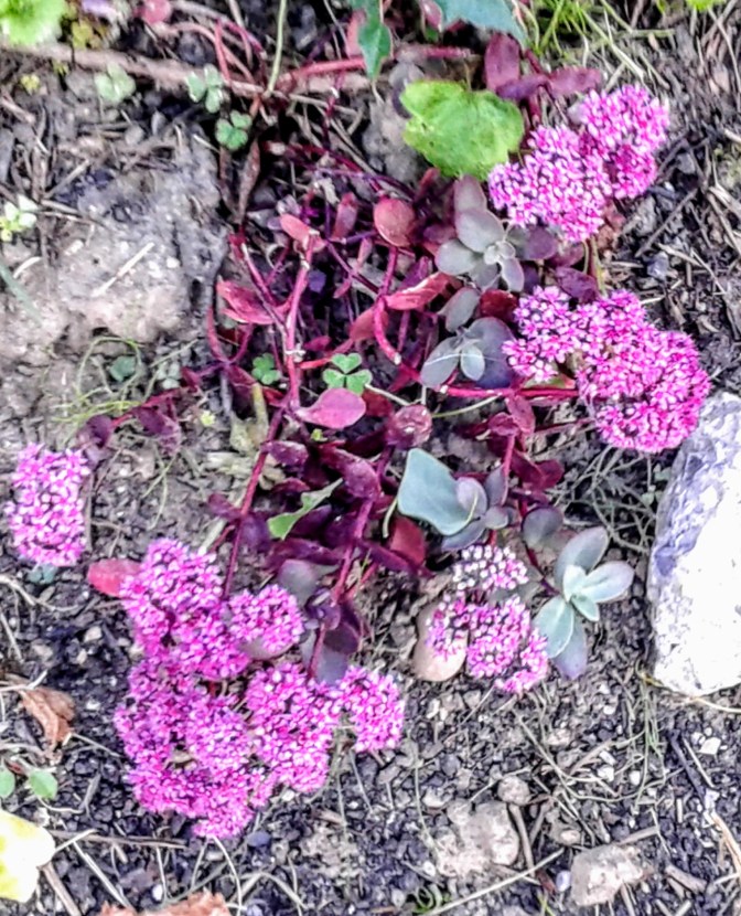 Years ago, I purchased some sprigs of sedum from a lady dividing her perennials. I was curious about these fleshy plants, which while not initially beautiful, were an interesting fleshy texture. I planted some pieces here and there, and left them alone. They became the low growing edging of the front of my long garden borders, with no maintenance from me. The sedum spread quickly, covered the low growing clover that sneak into my garden, and I don’t think I ever watered the garden in those days! Flash forward to my new smaller garden and I grabbed a few pieces of assorted sedums from my various plants and put them here and there in low and dryer areas of the garden. At the front of my sidewalk/outside fence garden, I planted 2 small clumps (2 inches diameter), which have spread in one season to 3 feet in diameter – filling in a problem dry area. It’s not beautiful yet, but it is keeping the weeds from encroaching and keeping the ground from eroding. – Shown above.