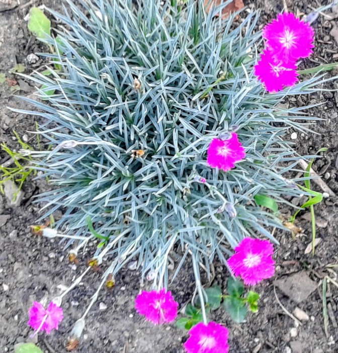 come back to life. In my garden they have a nice silver blue foliage and bright pink flowers, and the sweet williams have a pink/red and white flower. They are low growing mounds, and I don’t pay a great deal of attention to them. I do not find that they spread a great deal beyond their initial planting, and at some times, they have disappeared from my garden after a few years. When they initially bloom for me in late June and July, I wait for them to finish, and I simply take the scissors to the spent blooms and forget about them – until the rebloom occurs.