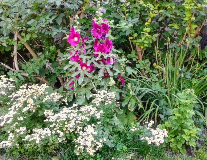 Hollyhocks grow in a variety of colours and can be quite tall – as much as nine feet. Mine are dark pink and about 3.5 feet. I think they are a little lost where I have planted them, next to some forsythias and lilacs, with feverfew in front. I would like to see next year a few more colours, and a greater quantity of plants, to give a more old-fashioned country garden aesthetic. I will plant them next year about 2 feet apart – as I have put them half that distance apart this year, and they look a little crowded.