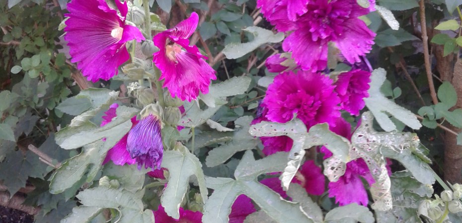 Hollyhocks grow in a variety of colours and can be quite tall – as much as nine feet. Mine are dark pink and about 3.5 feet. I think they are a little lost where I have planted them, next to some forsythias and lilacs, with feverfew in front. I would like to see next year a few more colours, and a greater quantity of plants, to give a more old-fashioned country garden aesthetic. I will plant them next year about 2 feet apart – as I have put them half that distance apart this year, and they look a little crowded.