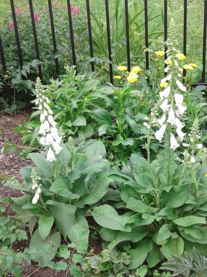 We have planted a variety of hostas, sedum and flowering perennials In order to be frugal, we have tried to invest in perennials on sale or those that can be divided to many small plants. Normally I would plant in multiples of 5 or 7 plants to create a sweeping border, but here if we found one suitable plant on sale, we snapped it up. So we planted one’s and twos of tickseed, Shasta daisy, salvia, foxglove and campanulla. Last year’s planting of rose of sharon, and purple coneflowers were not successful. I believe they were not planted deeply enough on the sloped garden, and that more soil was required to combat the erosion from rainfall, snow shovelling and winter road salt.
