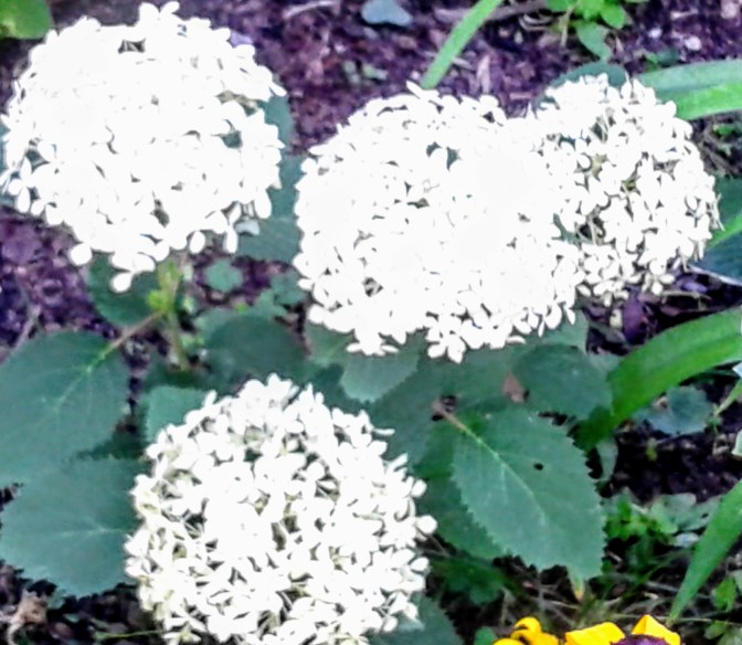 This one is the perfect Hydrangea of my dreams, with it’s round white balls of flowers and dark green leaves. It has probably survived because it is sheltered from the dog and the heat of this summer. Unfortunately it’s just in the wrong spot as it’s only visible from the porch directly above. At 2.5 feet in height, it’s lost behind the 6′ happy Black Eyed Susans. That’s OK for now. With such little Hydrangea success this year, I think I will leave it for now, and move it another year when I feel more confident.