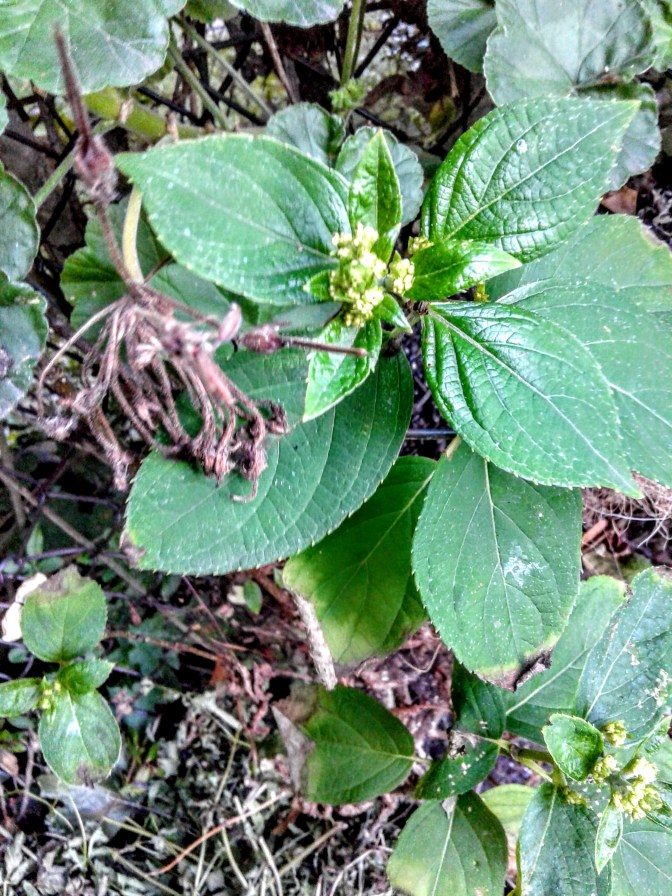 Another Hydrangea, planted a few feet down the row is similar. It is defoliated at the bottom, but producing shoots at the top, faring just a little bit better, and even a little bloom now that it’s September.