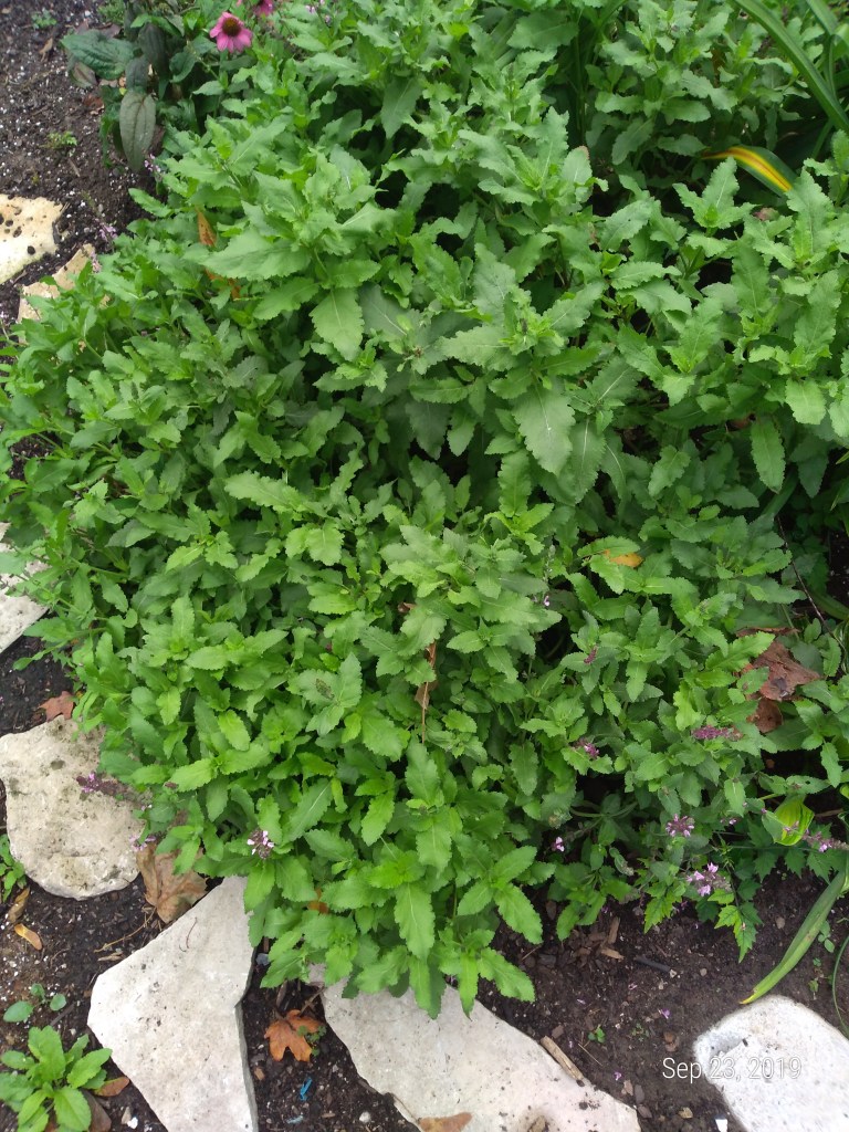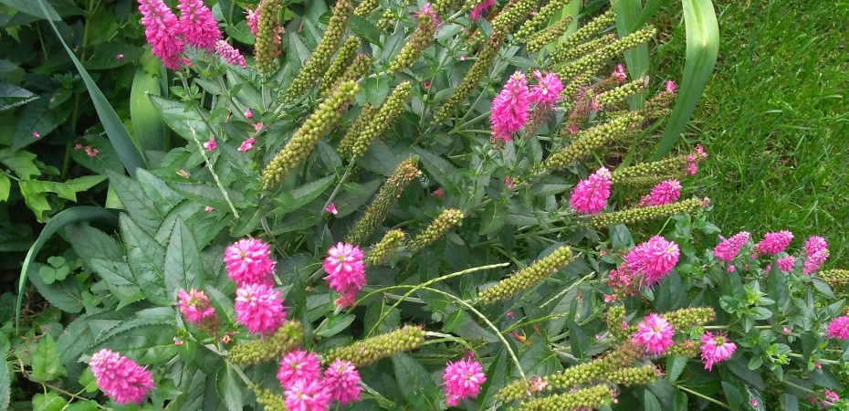Today in the front garden, the Veronica is still blooming – all summer long and through September with no deadheading . It looks a little crazy up close, but lovely from a distance.