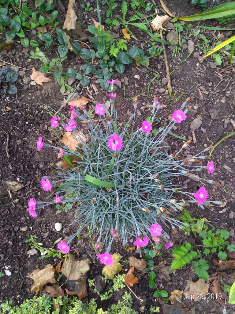 Tidy pinks are still blooming after a regular shearing. They have not spread from their original size.