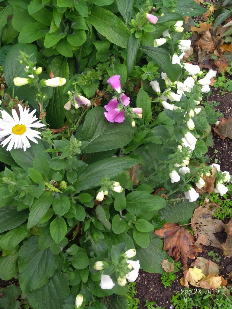 The long towers of Hollyhock flowers were removed a few weeks ago allowing more demure blooms to take over at the lower levels. The Shasta Daisy flowers enjoy laying down.