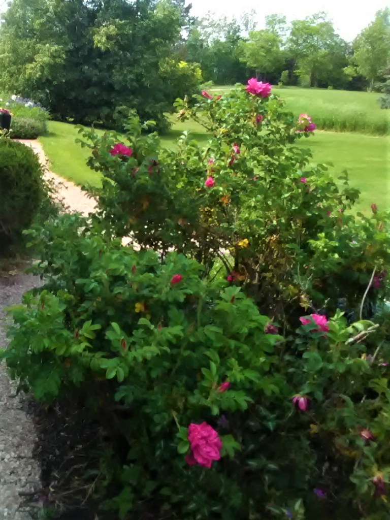 In my central front garden, I planted Morden Sidewalk roses (Parkland) – also in pink. These were developed in winter-cold southern Manitoba, and so very hardy for my garden. I believe that these were Morden Belle. They were a lovely consistent 3 feet in height and width, and rebloomed well for most of the summer.