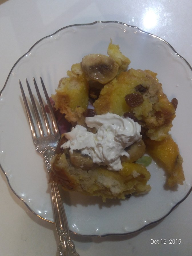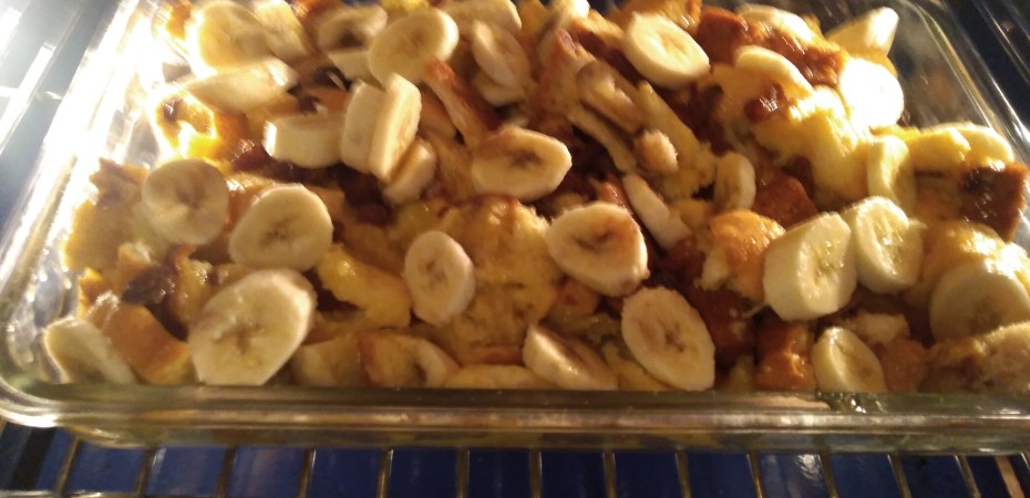 I have lots of leftover bananas (and they are a little tired of my banana bread) and loads of leftover bread to use up – including raisin bread. For an easy comfort food dessert I made a Banana Raisin Bread Pudding. I modified a recipe from Kraft foods, with a little bit of advice from Martha Stewart (she has a recipe as well).