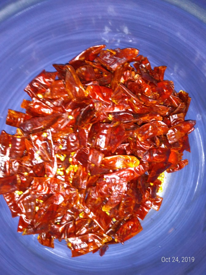 The chef at my favourite restaurant said that he uses only fresh hot chili peppers and extra virgin olive oil. The restaurant’s version is lovely, but I was worried about spoilage. If there is no vinegar or preservative, how would you prevent bacteria from sprouting? There are several fresh pepper versions of peperoncino oil on the internet, but I decided to follow the instructions of “The McCallums’s Shamrock Patch” blog at https://themccallumsshamrockpatch.com/2015/04/28/olio-di-peperoncino-italian-chili-oil/ which uses dried peppers.