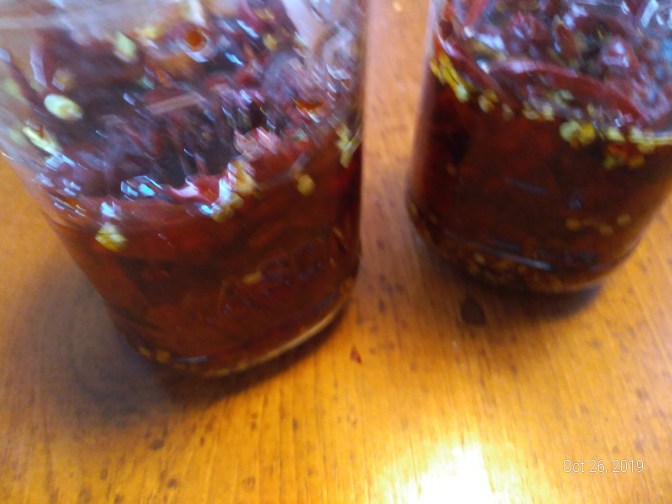 I kept all the chopped peppers and seeds, pulling out any little stem pieces that I found. I also added a half a cup of dried hot pepper seeds that I had on hand. I was ad libbing here. Then I poured the peppers into 2 sterilized jars, covered with extra virgin olive oil and sealed the jars. I am in the process of shaking the jars up every half day or so – and I’m keeping them in a cool dark place.