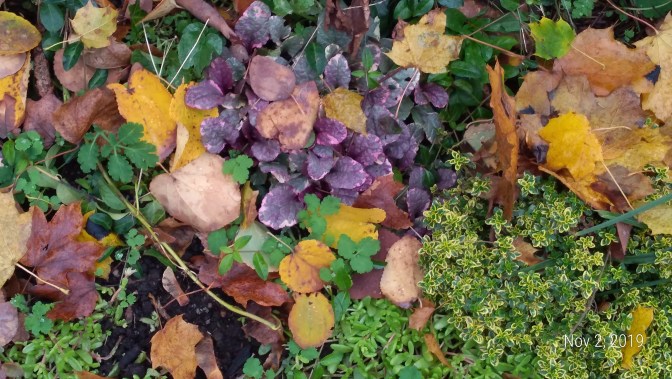 A few brave flowers are still bravely breaking though the fallen leaves.