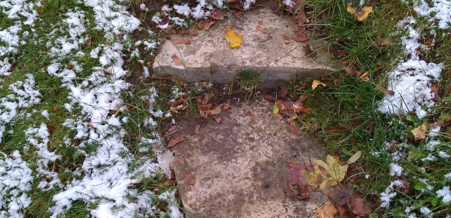 This simple project was something that was painful – in that the stones were heavy – but not difficult. We have a very odd drop-off in our yard which leads to the back of our house and a small strip of backyard. The drop-off is at least 6 feet in height, and we have planted grass to hold the ground, and an herb garden/rockery further over. We previously had some wooden steps which were falling apart and slippery, so we pulled them up and replaced them with stone steps. The stones were purchased from a local supplier of pavers and landscaping stones/ We measured approximately the slope that we wanted, and purchased 7 natural looking stones – longer than our big foot sizes! We also purchased some limestone screenings. We cut out the stone path with a shovel – on a cold day when the ground was solid and dry. I think that this would be a harder task if our ground was not so tightly compacted. Then we placed and levelled some limestone screenings at the base, followed by placing the bottom stone. We just worked bottom up, making sure the stones were stable, level and spaced a comfortable step above each other.