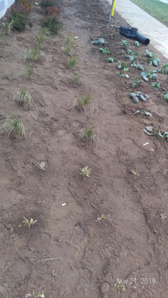 November planting of grass, shrubs, daylilies and bergenia cordifailia