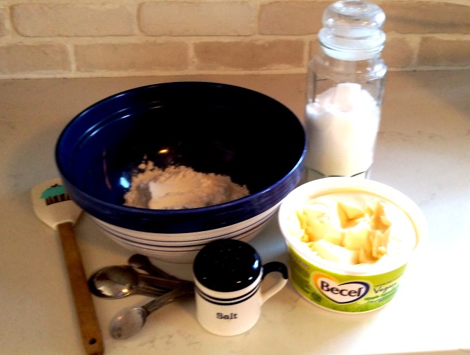 When I bake vegan, I leave out of course all dairy, eggs, meat by-products, gelatin and marshmallows (which contain gelatin). Using a vegan margarine is a great substitute for butter – but be careful – I just assumed that all margarines were vegan, being made with vegetable oil. This is not the case, as mahy margarines use milk by-products – check the small print. Why on earth do we need milk by-products in a vegetable based spread? Who knows, but because of this I use products that are specifically labelled as Vegan. In this case I am using Vegan Becel Margarine.