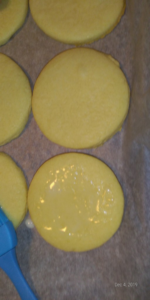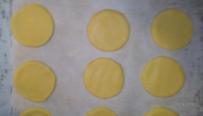 Cut cookies into shapes, with cookie cutters. (If cookie cutters become too sticky – dip in all purpose flour). Place cut cookies on to baking sheet lined with parchment paper.