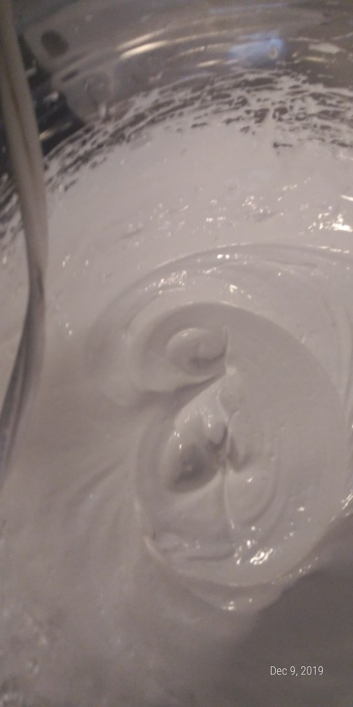 Line 3 cookie sheets with parchment paper. Move oven racks to middle to levels in oven. Preheat oven to 300 degrees F. (I used the convection setting in my gas oven). When the meringues are prepared you want to put them quickly in the oven – all at once.