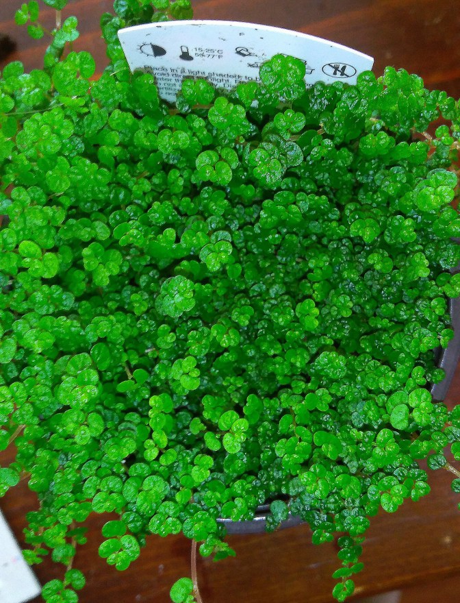 Along the way I grabbed some Baby Tears. I split them up between my planters. I like the contrast in texture of the tiny leaves, and the spread quite well, and should eventually spill over the edges of my pots. Baby Tears are low growing and spread easily and enjoy high humidity but no direct sunlight. They love humid terrariums but in my house they will be planted under my taller plants and misted regularly. They may not like living outside in my flower pots in the summer, but I will think about that when summer comes!