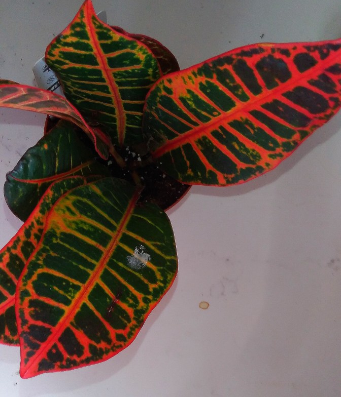 For a little colour, I bought a Croton, which has orange, red and green large leaves. It prefers medium/diffused sunlight and even moisture. This should be easy. Perhaps not – Croton apparently don’t like to be moved and tend to lose leaves after being relocated. That’s too bad because I just repotted it with the pelargonium and pilea. Apparently they recover quickly though.