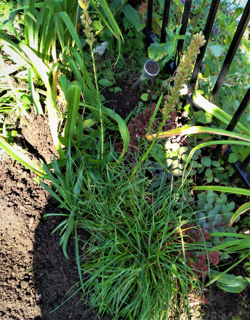 The Gayfeather flower stalks, lay down in the garden and had to be propped up, and eventually – either the dog, or a rabbit sliced the tops off of them, or perhaps it was SOMEONE WITH THE WHPPERSNIPPER!