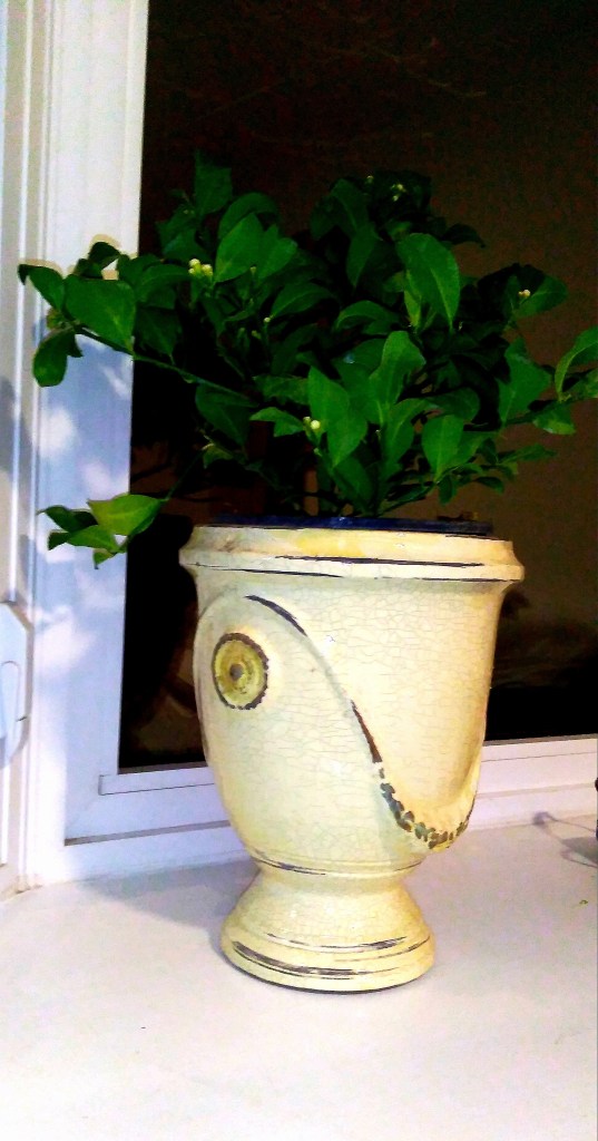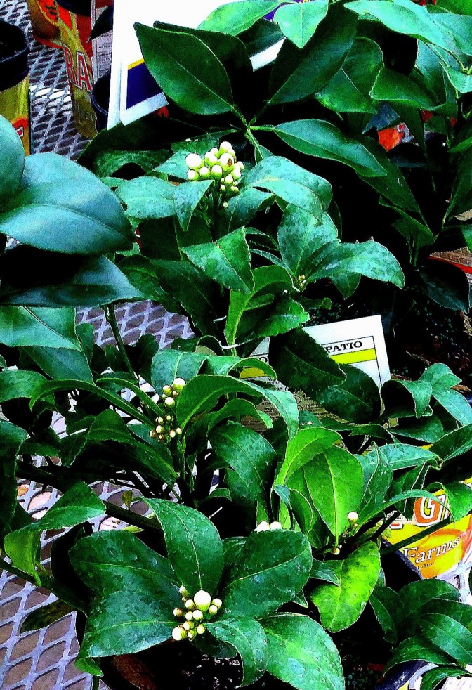 I was just happy to take a nice walk up and down the aisles, looking at herbs, tropical plants, and some shrubs being prepared for spring. I stopped by a display of citrus plants, and I thought that one might cheer me up. I picked a small lemon shrub, ready to bloom with small white flours. There were also tangerines and grapefruits, but I thought I would give this one a try.