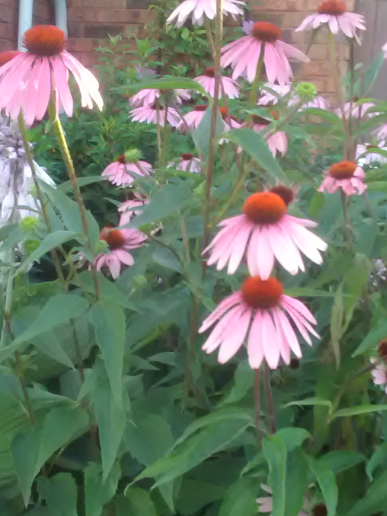 The flower heads are large with spiky seed pods in the centre – and the petals point downward – which gives them the “cone” appearance – hence the coneflower name.