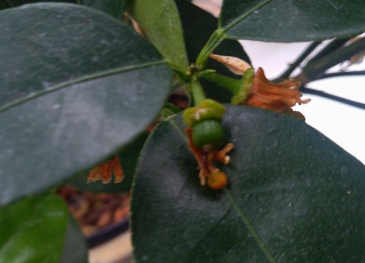 I have fertilized the plant, and I hope to re-pot it in a larger pot in the spring when I can work outside. In the meantime, the plant flowered beautifully, I pollinated the flowers with a craft paintbrush, the the fruit are still growing.