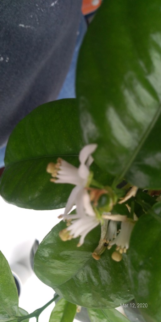 I used the same paint brush pollination technique with the Tangerine flowers that I had previously used with the Lemon flowers. The Tangerine flowers fell off much more quickly than the Lemon flowers – BUT – I do see some baby Tangerines starting!