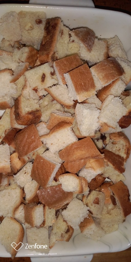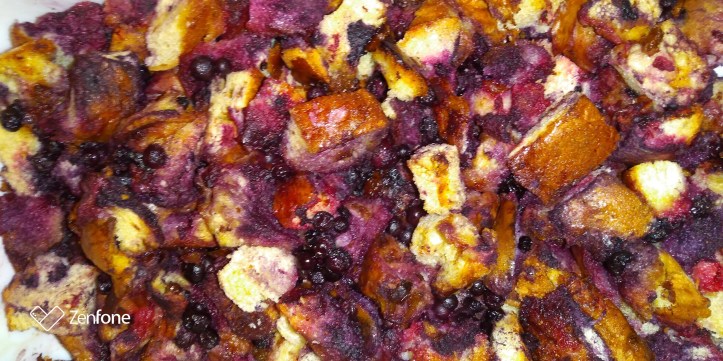 For this version of Blueberry Bread Pudding, I cubed 6 slices of raisin bread – I had frozen it as it was about to go past it’s best before – before the pandemic, and 3 breadcrusts. I checked all of the bread labels to make sure they had no egg or dairy – we need to be Vegan this time. I sprayed a shallow 7 by 12 casserole dish with non-stick spray. Then I added 2 cups of frozen blueberries, 1/3 cup orange juice, 1/3 cup granulated sugar, 1/4 cup Becel Vegan Margarine, 2 tablespoons RealLemon juice, and a sprinkle of salt. I lightly tossed all of this together and placed in a 350 degree oven for 40 minutes – stirring the mixture halfway through baking.