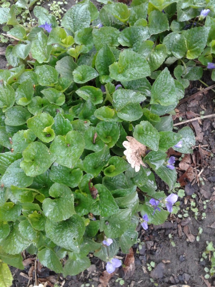 These Wild Violets have pretty blue flowers and appear everywhere in my garden. At first I left them alone, but I learned that they are a weed and can invade the lawn. I am pulling most of them, but leaving a few patches.