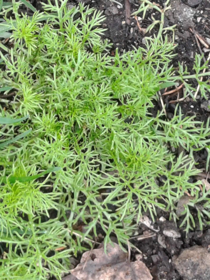 This little ferny plant has seeded here and there in my garden. I thought perhaps it was dill, and there were several similar plants that came up in my PlantNet search – but I suspect it’s Wild Chamomile – also called Pineappleweed or Mayweed. It’s pretty, and apparently it can be used in tea or salads, but the flower is fairly small for the plant – so I will declare it a weed and pull it!