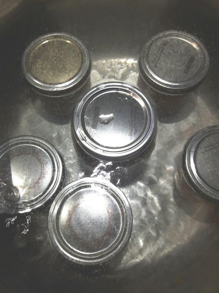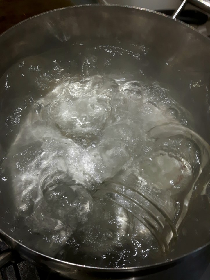 • Sterilize 6 clean 500 ml mason jars and rings in boiling water. I always prepare a few more jars for leftovers – if I’m lucky.