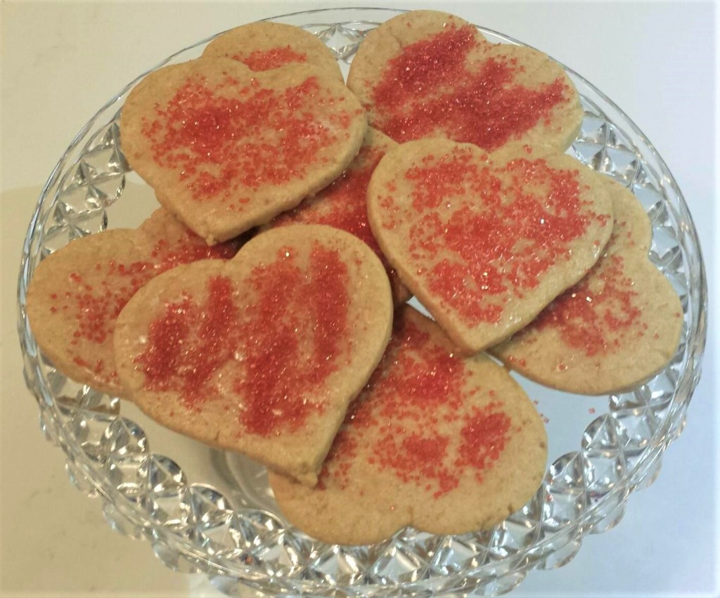 I am baking cookies to send to my University aged children. One is Vegan, one is seemingly vegetarian, and the other two are hungry omnivores. As I have red coloured sugar left over from my Christmas cookie project for decoration, I am just preparing a simple sugar cookie, cutting them in heart shapes, icing with an icing sugar wash, and sprinkling on red sugar. Easy peasy – sort of.