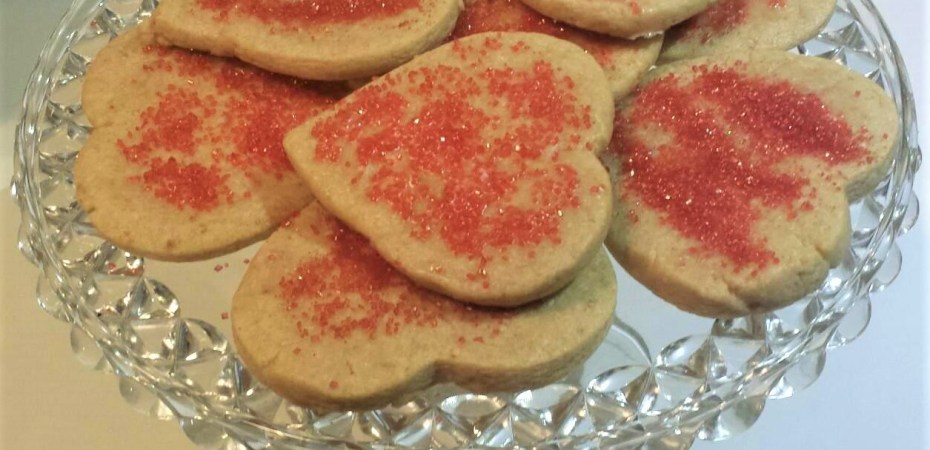 I am baking cookies to send to my University aged children. One is Vegan, one is seemingly vegetarian, and the other two are hungry omnivores. As I have red coloured sugar left over from my Christmas cookie project for decoration, I am just preparing a simple sugar cookie, cutting them in heart shapes, icing with an icing sugar wash, and sprinkling on red sugar. Easy peasy – sort of.