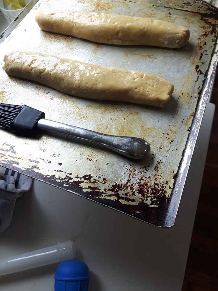 Divide dough into 2 balls. On a lightly floured surface, turn each dough ball into a 9″ by 2 1/2′ or so roll. The dough should be fairly firm and easy to work with – just give each a quick roll in the flour into a tube shape. Place rolls on prepared cookie sheet.