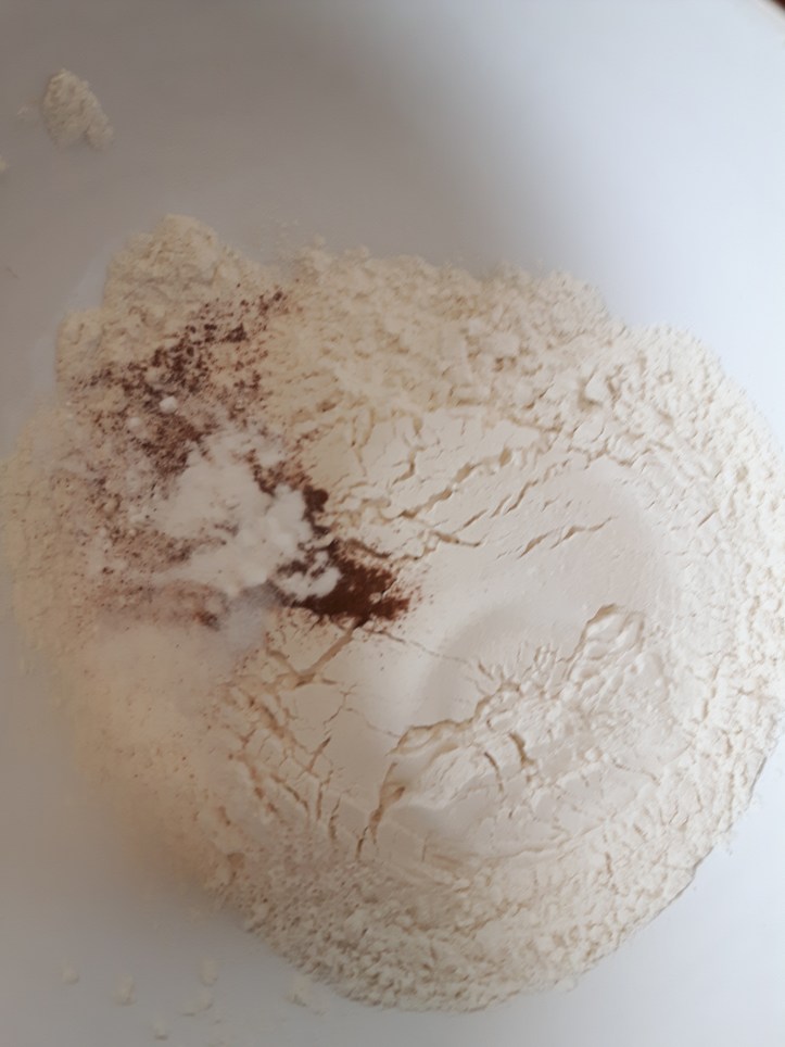 Mix dry ingredients in bowl (Flour, cinnamon, baking powder and salt) – set aside.