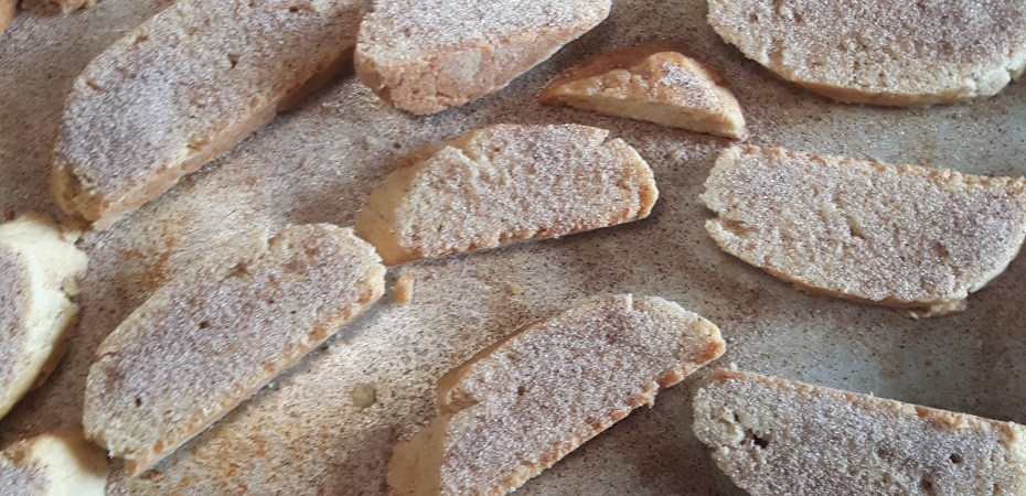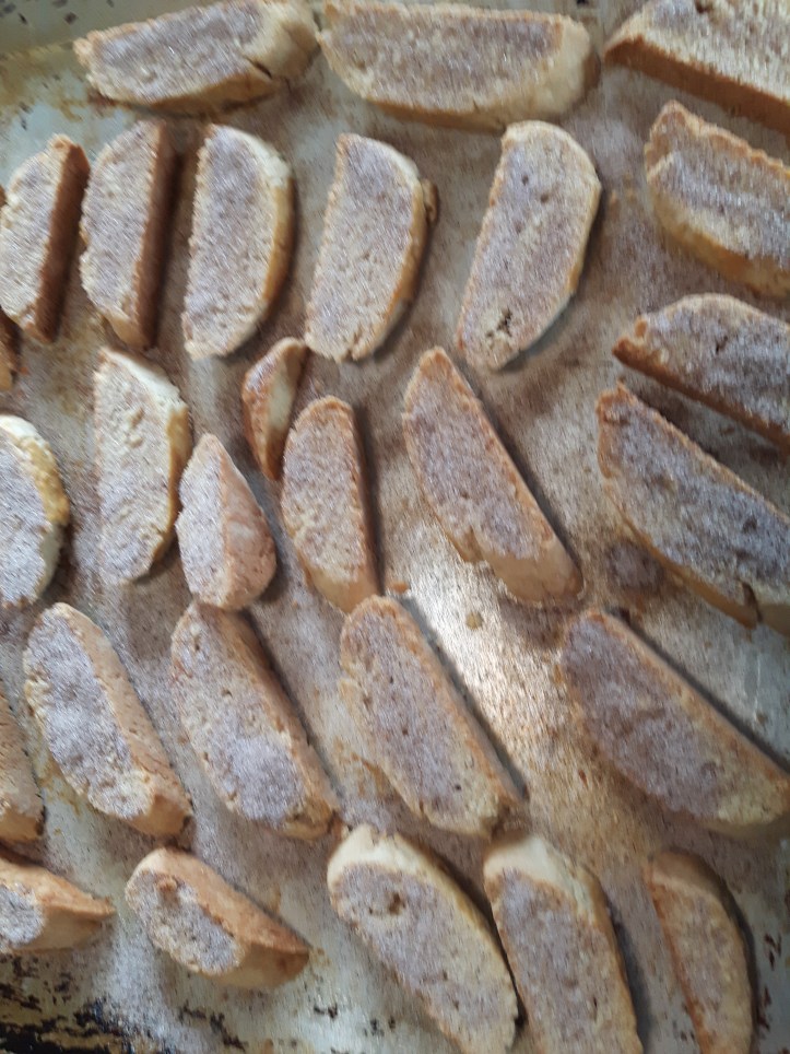 Today I’m experimenting with Cinnamon Biscotti. This recipe yields one baking sheet full of biscotti slices. Biscotti is simple to bake – generally flour, butter, sugar, eggs and whatever flavourings are in the recipe. The dry ingredients and wet ingredients are mixed separately, then combined – and the dough is formed into a roll, which is baked, cooled, sliced and THEN……. baked again! That’s what gives it the nice crispy texture.